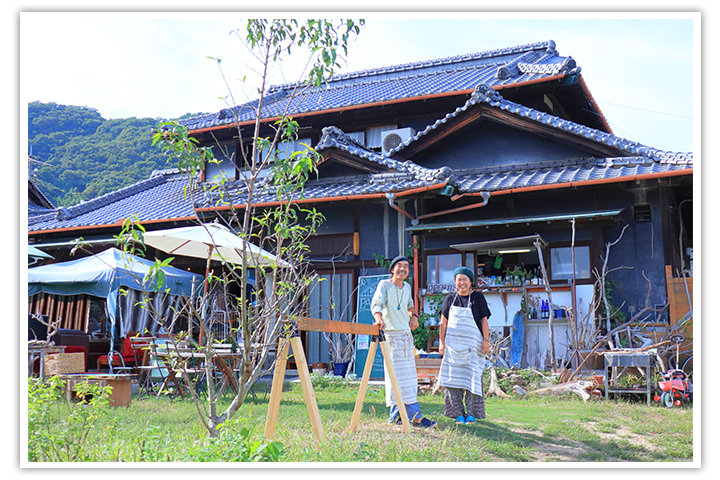 高根みかんで有名な高根島。島に1軒しかないカフェを目指して細道を入っていくと楽園的古民家の看板がお出迎え。中に入ると「高根パラディーゾ」の大泰司幸嗣・聡美さんのご夫妻がにっこりとあいさつをしてくれました。 古民家をリノベーションしたカフェは、室内の随所に花やアートが飾られて和やかなムード。名物の島のいのししをソーセージにした“しまししソーセージ”は滋味深い味わい。島の柑橘を食べて大きくなっているだけに、肉質も柔らかくてクセがないのだとか。