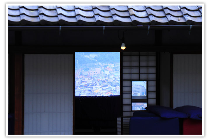 [PHOTO POINT]尾道らしい写真といえば、千光寺の上から港町を見下ろす撮り方が有名。でも、坂の途中のお宿の窓を通した景色は、自分だけのフレームを探せたようで一層素敵に見えました。