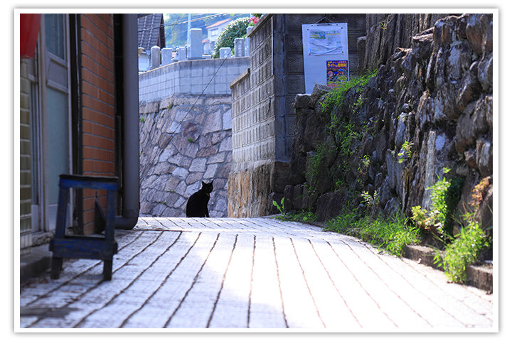 ぐるぐると行ったりきたりした坂道とも、そろそろお別れ。カメラには、細い路地で出会った猫たちの表情がたくさん収まっています。尾道で出会った猫たちは、近すぎず、遠すぎず、ほどよい距離で撮影をさせてくれました。この黒猫は、このあと坂の上のなじみのお家にご挨拶。お家の方も慣れたふうに声をかけていました。尾道らしいまちのワンシーンは、足をつかって歩き回るときっと遭遇できることでしょう。
