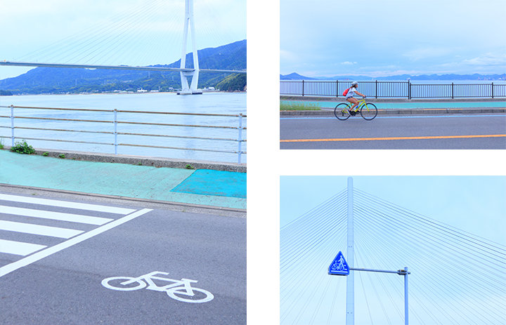夜が明けて朝を迎え、船に乗って出かけてみることにしました。車とともに橋を渡り、生口島の瀬戸田からみかん色の橋でつながった高根島へ。楽園という名の古民家カフェ「高根パラディーゾ」を目指します。道中、しまなみ海道のサイクリングロードを走るサイクリストの清清しいこと。広島県尾道市と愛媛県今治市をつなぐ約70kmのサイクリングロードは、アメリカのテレビ局CNNが選んだ「世界7大サイクリングロード」のひとつに選ばれています。瀬戸内の島々を駆け抜けるサイクリストの背中に爽やかな風を感じて、パシャリ。
