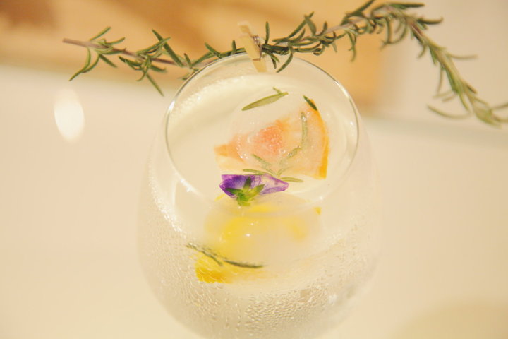 また、自家製ジンで作った「フルッタリウム」も人気です。こちらのサワーの中にはフルーツやエディブルフラワーを閉じ込めた氷が。ローズマリーの香りを楽しみながらひとくち飲むと、フルーツのあわい香りと甘辛いジンの深みのある味が喉の奥に広がります。