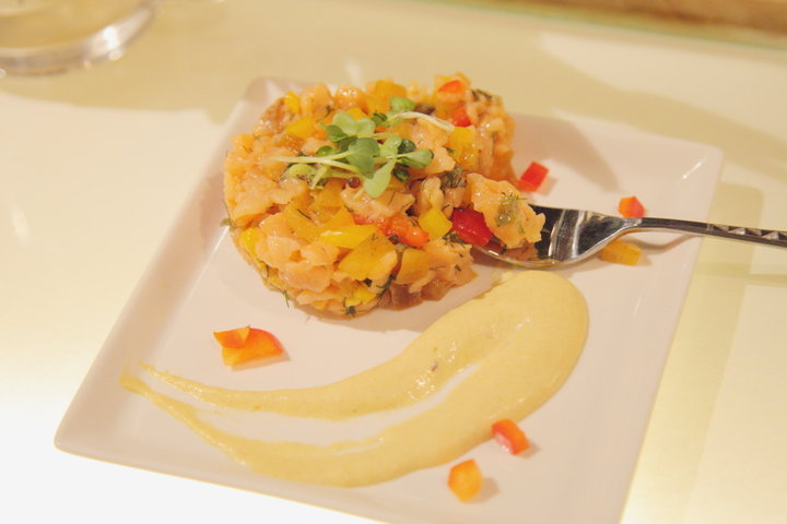 「季節フルーツとスモークサーモンのタルタル」(880円)。シャキシャキのパプリカもアクセントに