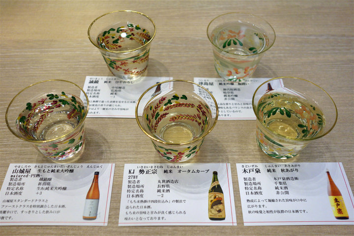 日本酒初心者におすすめなのが「利き酒セット」。3種類セット(1300円)と、5種類セット(1500円)があり、それぞれに日本酒の名刺「PONCA(ポンカ)」が添えられています。利き酒師さんのおすすめ通りに飲んでみると、フルーティーな飲み口から、香りが華やかなもの、さらに芳醇なコクを感じられるものへと変化し、味わいの違いがよくわかります。