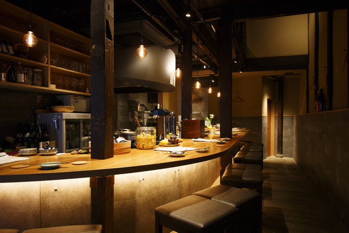 京町家の柱や梁を残しリノベーション、木の風合いを活かした温かみのある空間です。道路側は扉を解放した気さくに飲める立ち飲みスペース、店内にはライブ感あるオープンキッチンを囲むカウンター席があります。そして2階には座敷と、好みのスタイルで利用できるお店です。
