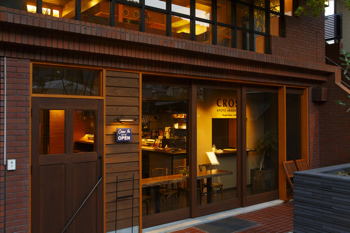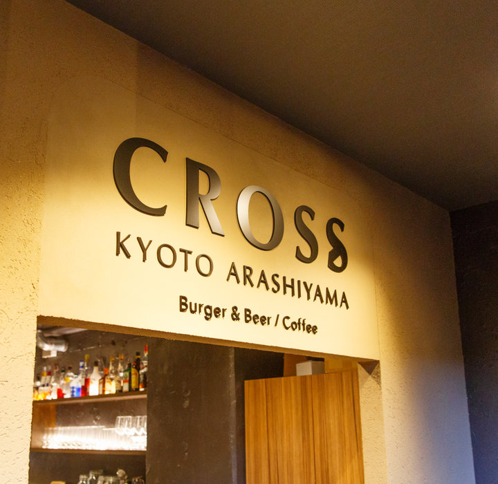 阪急嵐山駅から徒歩約5分。落ち着いた住宅街のホテル1Fに「クロス バーガー&ビアー/コーヒー」はあります。木と煉瓦の風合いを活かした温かい雰囲気の店内には、カウンターや大きめのラウンドテーブルなどがあり、1人でも、仲間と過ごすのも心地良い空間。隣に座ったことをきっかけに会話が始まることもよくあるのだそう。