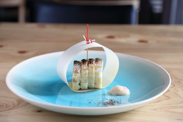 「ポテ鯖」は松前寿司に見立てたポテトサラダ。ご飯ではなく、明太子と白ワイン、西京味噌に食感のいい奈良漬を入れたポテトサラダに、炙ったシメサバがのった一品です。食材の組み合わせ、和テイストな盛り付けにも料理長の細部にわたるこだわりが感じられます。