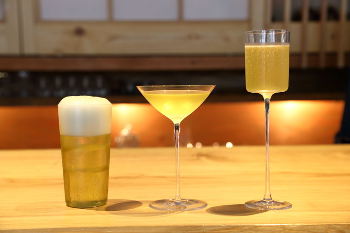 右から「煎茶のスパークリング」(750円)、「八女本玉露のマティーニ」(1400円)、「煎茶のジントニック」(800円)