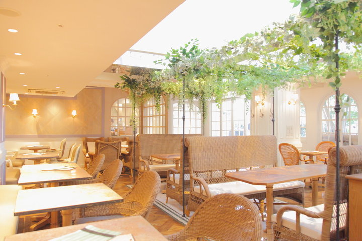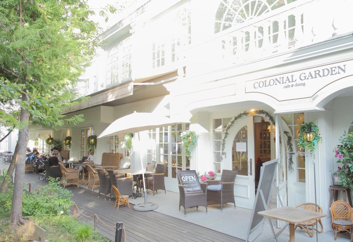 クラシカルな白い建物は、シンガポールを代表する名門ホテル「ラッフルズ・ホテル」の開放的なコロニアル様式の空間をイメージして造られたもの。庭園に面したテラス席はもちろん、室内のテーブル席でも緑を感じられ、ゆったりとした気分でくつろげます。