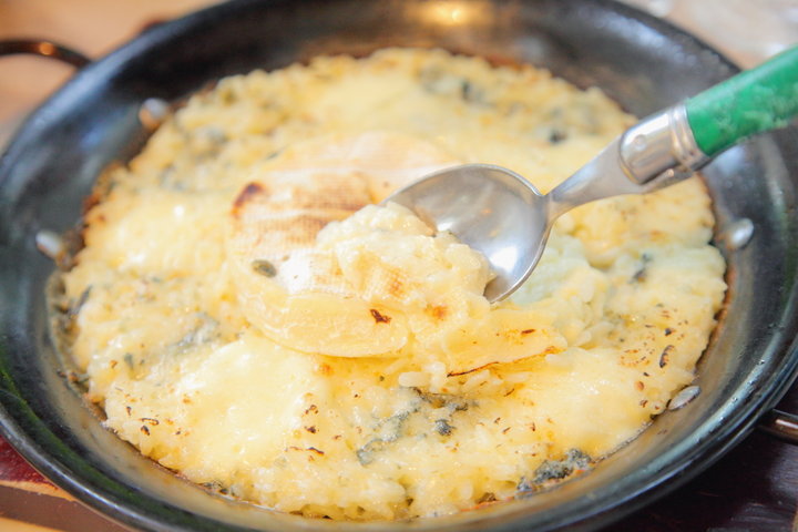 スイス産ゴンゴンゾーラやモッツァレラを使用した「石窯で焼き上げた丸ごとカマンベールチーズ! 濃厚な4種チーズの鉄板焼きチーズリゾット」も、奥深い味わいです。あつあつなので火傷しないように気をつけて。チーズの香ばしいカリカリおこげもたまりません。