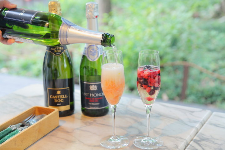 おすすめのお酒は、世界各地のワイナリーへ出向いて生産者から直輸入しているスパークリングワイン。フランス王室ご用達の「ランケイ」(ボトル4968円)や香り豊かな「セントノーレ」(グラス745円)など、ほかではあまり飲めないものを選りすぐっています。 また、ベリーや白桃をごろごろ入れたグラスにテーブルでスパークリングワインを注いで完成させるカクテルも。フルーツの風味や甘味が溶け出し、口をつけると甘酸っぱい香りがふわっと漂います。さっぱりとした味わいも、濃厚なチーズ料理にぴったりです。