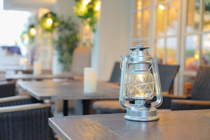ビルの谷間に浮かんでいるような空中庭園ダイニング。テラス席は夜になるとランタンが灯る