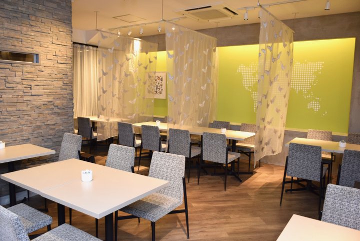 木目や緑など自然を感じさせる落ち着いた雰囲気のカフェスペース