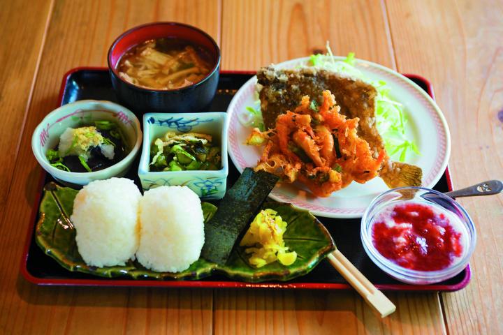 棚田のおにぎり定食1280円。瀬戸内の魚のフライなど日替わりおかずに汁物、小鉢、デザートが付く