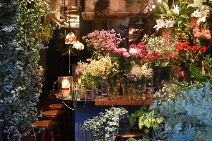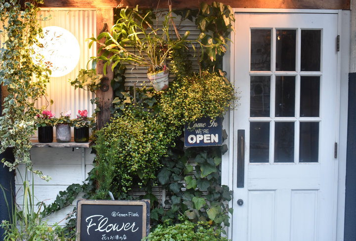 地下鉄広瀬通駅から徒歩約3分。仙台市中心部のアーケード街から一本細い路地に入ったところに、「& Green Flash Bar Flower」はあります。花とお酒を愛するマスターが「きれいな花に癒されながらのんびりお酒を楽しんでほしい」という想いからオープンした、フラワーショップを兼ねたバー。店内外のいたるところに、たくさんの花やグリーンが飾られています。