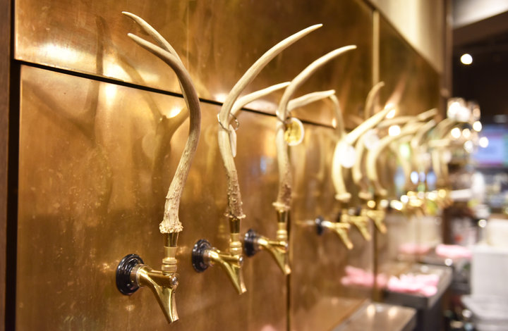 神田駅から徒歩1分。オフィスも多い神田の駅前に「シュマッツ 神田」はあります。 店内に入ると目をひくのが、広いバーカウンターとオープンキッチン、そしてズラリと並ぶ黄金のビールサーバー。 店内奥にはテーブル席が並ぶ広々としたホールもあり、カジュアルで開放的な雰囲気です。