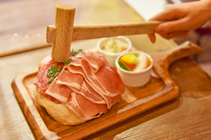 「ドイツのミレニアム世代が食べている現代の“ドイツめし”を日本に届けたい。」 そんな思いから生まれた、進化系ドイツ料理も「シュマッツ 」の特徴です。 なかでも目をひく「ドイツ風シャルキュトリボード」は、木槌でクラッカーを割って楽しむスタイル。 飲み会などで盛り上がること間違いなしの一品です。ドイツ産の生ハムはビールとの相性も抜群ですよ。
