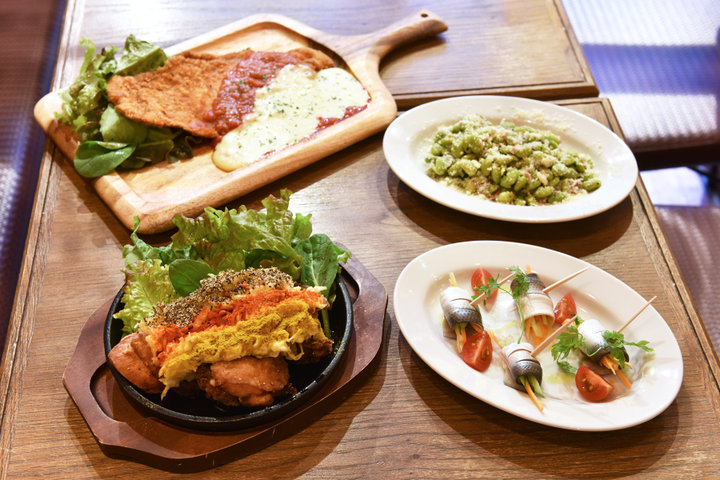左上から時計回りに「シュニッツェル・パルミジャーナ」(1490円)、「ガーリックチーズ枝豆」(518円)、「こはだのロールモプス」(540円)、「ジャーマンタルタルから揚げ」(734円)