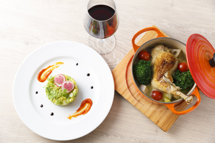玉ねぎ、にんじん、れんこん、かぶ、プチトマトなど季節の野菜と骨付き国産肉を煮込み、イギリスマルドンや、京丹後など3種の塩で味付けた「国産骨付き鶏モモ肉の塩スープ」。鶏の旨味や野菜の甘みいっぱいの滋味深いスープや3時間煮込んだ柔らかな鶏肉が美味しい人気メニューです。 煮込み料理は、赤ワインに漬け込み煮込む「牛肉の赤ワイン煮込み」など伝統的なフランス料理や、バニラの香りが広がる甘じょっぱい味付けの「国産豚バラ肉煮込みバニラソース」の個性派煮込みなど30種ほどある定番メニューのほか、当日のおすすめが登場することも。