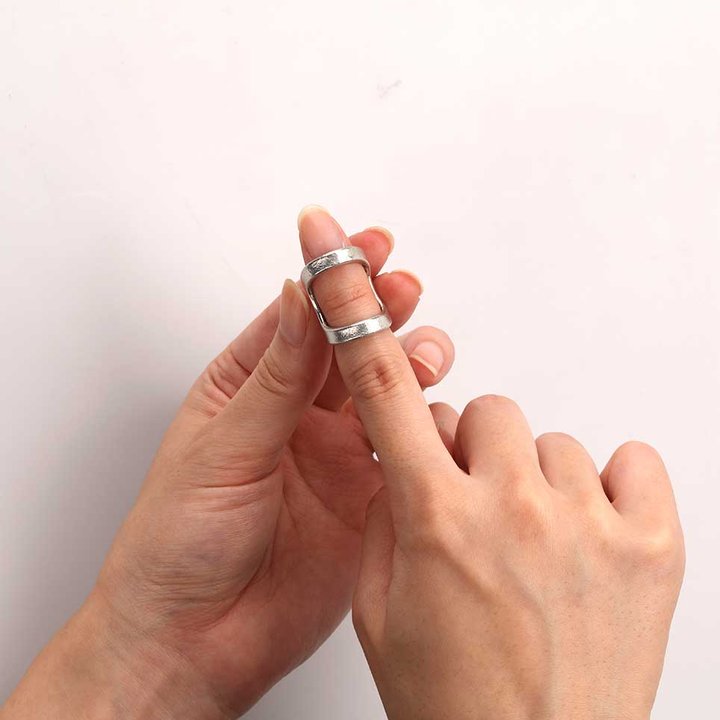 変形に伴う痛みや腫れのある指の第一関節に装着して、安静を保つことができる『ヘバーデンリング』。錫の“曲がる”特性を生かした。