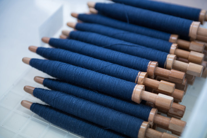 藍色のボビン。これを「杼」にセットする。織りあげた布に「耳」が出るのが「シャットル織機」の特徴。