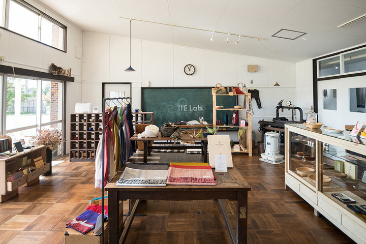 田園地帯を蛇行しながら流れる阿賀川に主峰・飯豊山(いいでさん)を抱く飯豊連峰。のどかな景色の中に、突如現れる凸凹屋根のレトロな建物。ここは、廃校になった幼稚園を借り受け、現代のライフスタイルにも取り入れやすい会津木綿の商品を提案する研究所『IIE Lab.(イーラボ)』です。明るく開放的な空間は、織機のある工房、縫製を行うミシンルーム、商品を販売するショップの3エリアに分かれています。