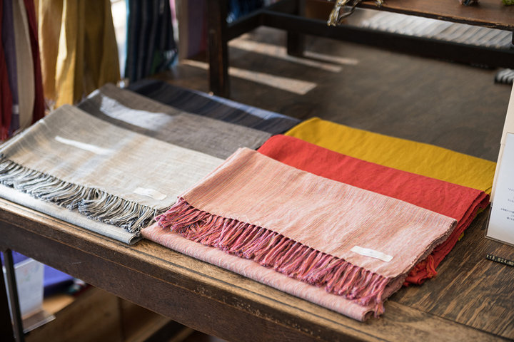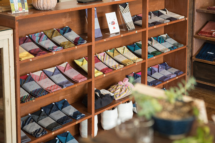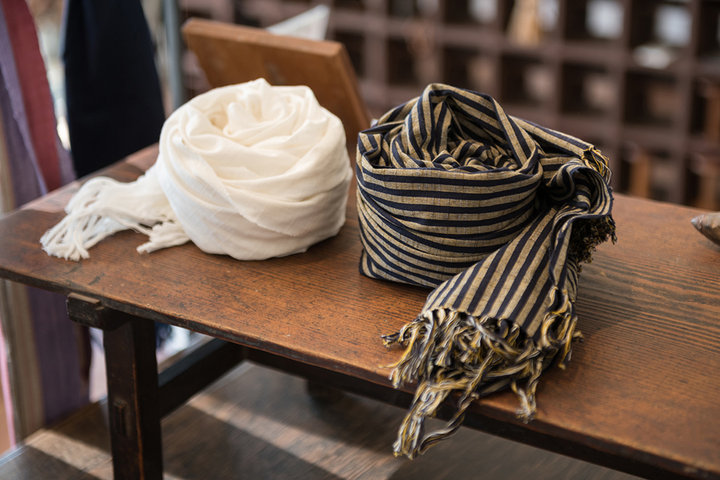 もともとラボがある青木地区は藍の栽培が盛んでした。たびたび氾濫する阿賀川の水害に強い作物として育てられていたのです。やがてあたりには染屋が立ち並ぶようになり、紺地に白い縞を織りだした青い縦縞が特徴の「会津青木木綿」が生まれました。興隆を極めたのち、一時は衰退してしまった「会津青木木綿」ですが、谷津氏や千葉氏が地元の職人を訪ねて彼らの頭の中にしかなかったレシピを継承。更に新たな感性が吹き込まれた『IIE Lab.』の商品はカラーバリエーションが豊富です。ショップには従来の伝統工芸品とは一線を画す色味のストールやネクタイ、ハンカチやブックカバーが整然と並び、物欲が刺激されます。