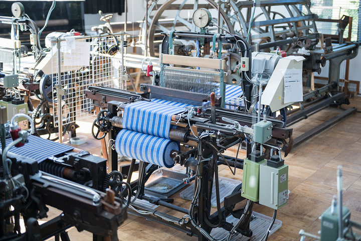 とはいえ古い織機なので、故障しても新しい部品への交換は望めず、もっぱら使用していない織機からの部品取りに頼っています。「70年働いてきたのにまだ働かせようというのですから、ちょっとかわいそうな気もするんですけどね」と千葉氏。織機がスムーズに動くよう常に油を差すので、各パーツから汗のように油が滴ります。その様はまるで生きもののよう! ふと見ると、油で床が汚れぬよう小さなトレーがいくつも並べられていました。「自分たちでこの場所を作り上げてきたという気持ちが強いので、みんなで壁を塗り上げた日のことを思い出すと汚せないんですよ」と千葉氏。