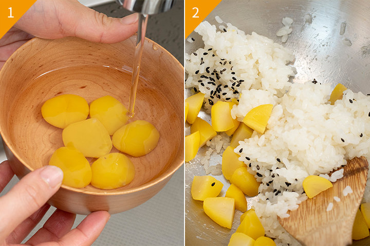 1/水に浸けておくと、甘露煮の栗の余分な甘さが抜ける 2/栗の刻み方はお好みで大きさを変えて楽しんで
