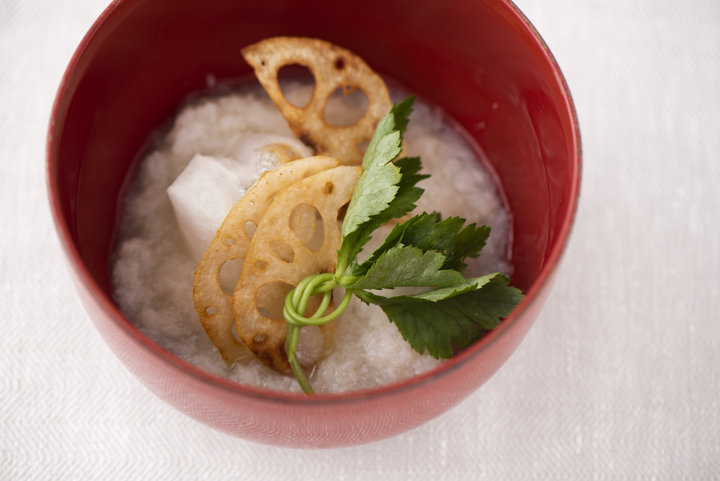 水温が高く、肥沃な土壌である茨城県の霞ヶ浦周辺。都内に出回っている蓮根の約9割、全国の半分近くがこちらで育てられているのだそう。 穴が空いていて、先が見通せることから、縁起物としてお正月の食卓に必ず並べられる食材、蓮根。すりながしスープに焼いたお餅や三つ葉を添えれば、さらに華やかになりますよ。 【材料】(2人分) ・蓮根…1節 ・ゆず皮…適量 ・餅…1個 ・水菜…5センチ ・★水…300cc ・★白だし…大1 ・★酒…小1 ・塩…小1/4