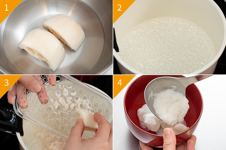 1/すりながしが黒くなるのを防ぐため、蓮根の表面を酢水につけて 4/最後に三つ葉の茎をクルンとひと巻きして、飾りに