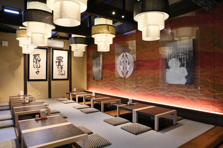 テーブルと掘りごたつ席があるレストラン店内