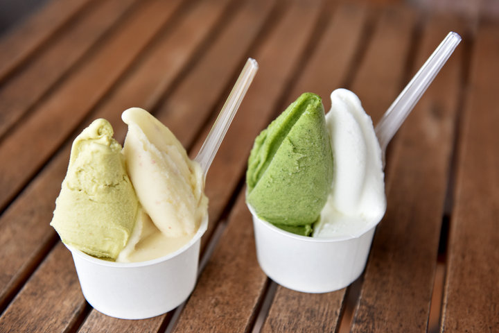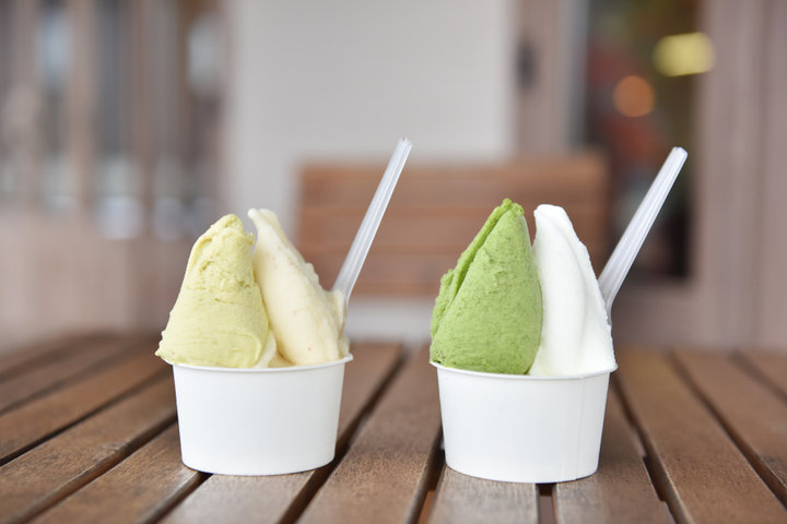 左から、一番人気の「ピスタチオ」、「りんごソルベ」、「霧島茶ソルベ」、「クオーレミルク」。(ダブル400円~)