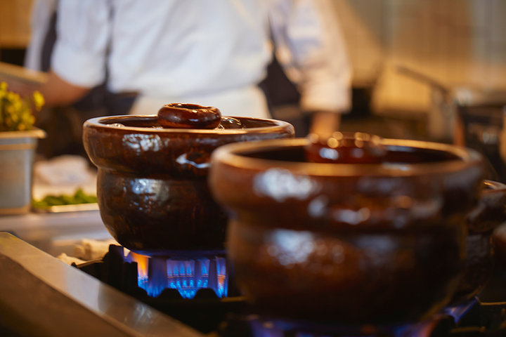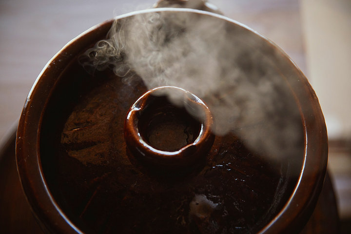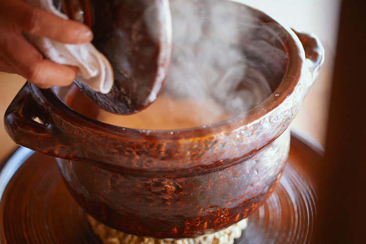 手を加えすぎず、味を殺さず、特にメインディッシュとなるお米は、炊き上がった瞬間からお焦げができるまでの、すべての状態と味を楽しんでもらいます。滋賀県の窯元・一志郎窯に特注した土鍋は、『朝食喜心』が求める最上のご飯を炊き上げられる逸品。これをそのまま客席にすえ、蒸らす前の「煮えばな」の状態から供します。