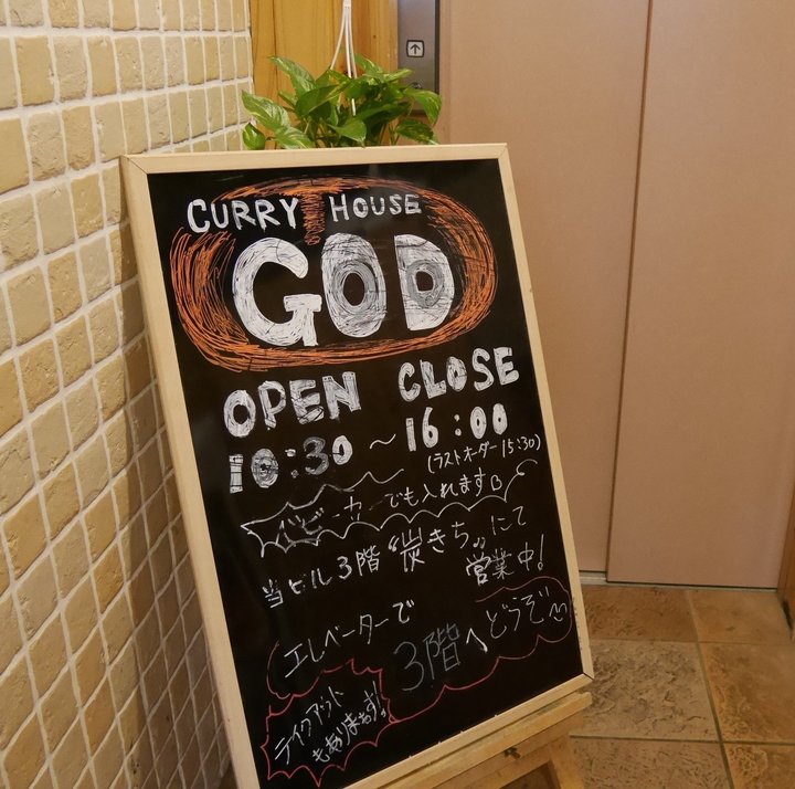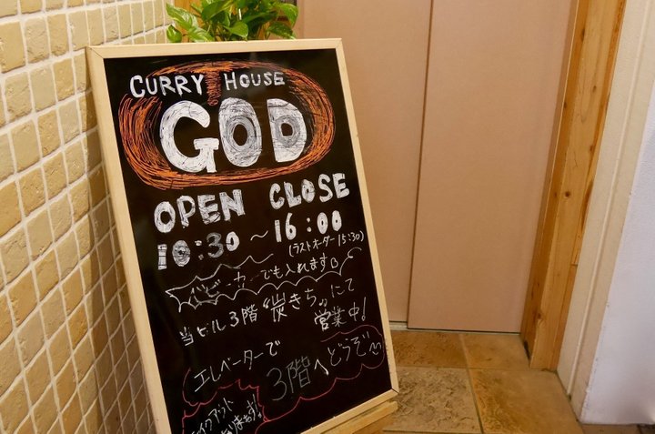 焼肉店「炭きち」の店内を昼間だけ借りて営業しているカレー専門店「カレーハウスゴッド」。当然ながら店内はカレー屋さんらしい雰囲気ではありませんが、ここで食べられるカレーは本格的で見た目のインパクトも抜群だと評判を呼んでいます。目印はビルの入り口にある立て看板のみなので、向かう際は見落としに注意しましょう。
