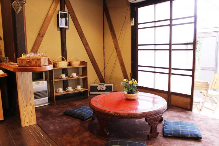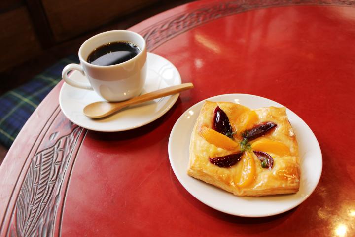 窓側のカフェコーナーは、アンティークの赤いちゃぶ台と座布団が置かれていて、田舎のお家を訪れたようにどこか懐かしく、温かみのある空間。お天気の良い日にはテラス席もお目見えします。 ドリンクはコーヒー、紅茶、ジュースがどれも350円。パンコーナーから好きなパンを選んだらお皿に載せてくれるので、ドリンクとともにのんびり味わえます。