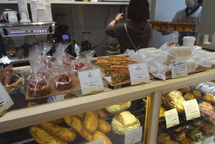 お店に入ると手前のスペースにあるのは、「パンとエスプレッソと」。「厚焼き玉子サンドセット」(421円)などバラエティ豊かなサンドイッチや、「パンとエスプレッソと」の看板メニュー、ミニ食パン「ムー」(330円)など全30種類のパンが並びます。