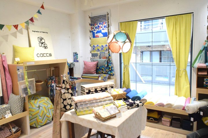 1Fの奥はテキスタイルショップ「cocca」。ここでは、季節ごとに変わる約100種類の生地や、布を使ったさまざまな雑貨が販売されているほか、スカートやクッションカバーなどのオーダーも承っています。