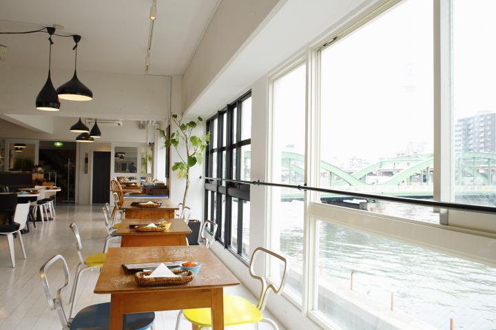 窓際の席から、隅田川と東京スカイツリー®が望める抜群のロケーション。契約農家から届く、こだわりの野菜を使ったカジュアルビストロ料理や手作りスイーツをどうぞ。