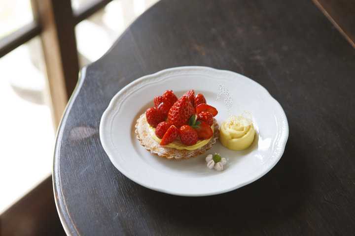 毎週インスタグラムでアップしている日替わりスイーツも好評です。今の季節によく登場するのが、いちごを使った「いちごのタルト」(850円)。大き目サイズのタルト生地の上に、カスタードクリームと大小さまざまないちごがのった贅沢な一品です。