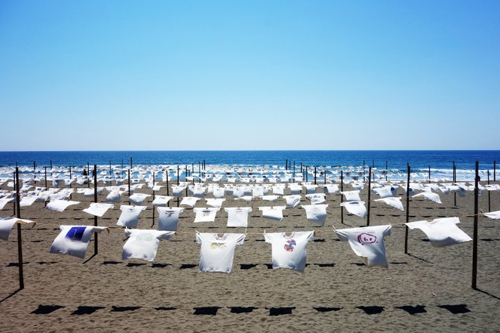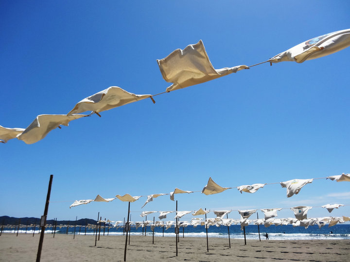 高知・黒潮町「砂浜美術館」で毎年開催されている「Tシャツアート展」。 公募の絵や写真をTシャツにプリントし、洗濯物を干すように砂浜に並べ展示します。真っ青な空や海を背景に、約1000枚のTシャツが潮風に揺れる風景は圧巻。 時間の流れとともに姿を変えるその風景作品はもちろん、日替わりの楽しいイベントも盛りだくさんです。初夏の一日を、まるごと砂浜の美術館で過ごしてみては?