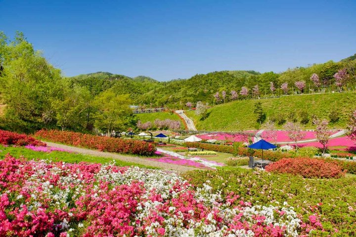 4月中旬~6月中旬までの期間限定で開園する「花郷OKADA(はなごうおかだ)」。山を切り開いて作られた、この花公園の広さはなんと甲子園球場の5倍以上!この圧巻とも言えるスケールの敷地に、20種類以上もの春の花々が咲きほこります。 山の斜面をピンク色に染める芝桜。花の絨毯とは、まさにこのこと。それもそのはず、11万5000株も植えられているのだとか。この芝桜の絨毯の周りを八重桜やチューリップが彩ります。