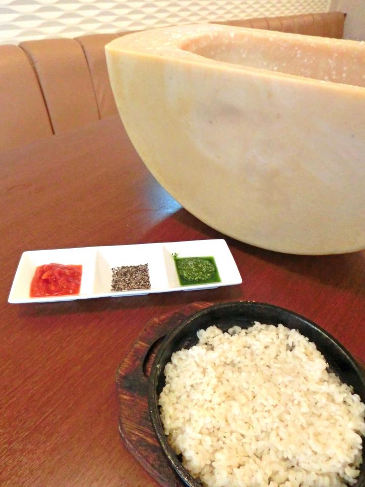 “チーズの王様”と呼ばれるイタリア産の「パルミジャーノ・レッジャーノ」を器にして、お客さんの前で仕上げてくれるリゾット(990円)も人気です。 直径約40cmの巨大な半円形のチーズと、熱した鉄板がテーブルに運ばれてきます。チーズの表面をスプーンでこそげて鉄板の上へ。次に、チーズのくぼみにあつあつのリゾットを入れ、チーズをこそげながら独自の芳醇な香りとうまみをまとわせるように混ぜ合わせます。鉄板のチーズが焼けてきたら、その上にリゾットをのせて完成。 チーズをからめたリゾットと、こんがり焼けたチーズのおこげをいっしょに食べると、香ばしさとカリカリの食感が同時に味わえます。添えられたジェノベーゼソースやブラックペッパー、フレッシュトマトで自分好みにアレンジしてもOKです。 チーズフォンデュやピザといった定番メニューのほかにも、30種類を超える専門店ならではのチーズ料理に注目です。明太子、わさび醤油、はちみつとクリームチーズを和えた「三種のクリームチーズ」(450円)、蒸した男爵イモの上でチェダーチーズがとろける「北海道産丸ごと男爵芋のチェダーボロネーゼ」(500円)など、さまざまな調理法でチーズを楽しむことができます。