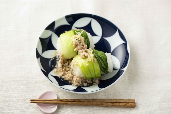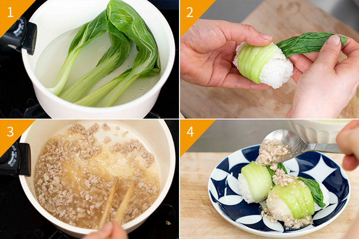 【作り方】 1:チンゲン菜を柔らかくなるまで茹でた後、粗熱をとっておく 2:塩を軽くふったごはんを俵型に握り、1のチンゲン菜を巻く 3:鍋に★を合わせて煮立ったら、鳥ひき肉を入れて煮込む。肉の色が変わったら水溶き片栗粉を入れてとろみをつける 4:火を止めてから生姜を入れて、おにぎりの上にあんをかけたら完成 (ごはんさんより) 「チンゲン菜は葉が青々としていて茎の丸みが小さいものを選びましょう。持ってずっしり重みがあるものが甘くて美味しいですよ。茹でる時は、葉の色が鮮やかに変わったらすぐに取り出して。長時間、火に通すと、色が変わってしまいます」