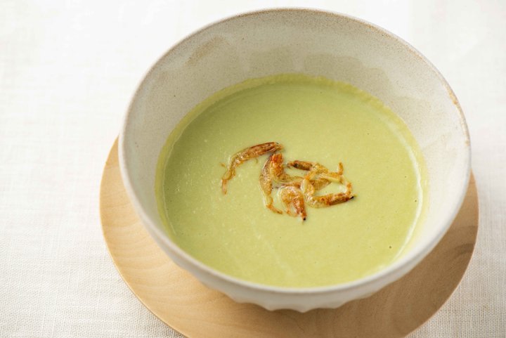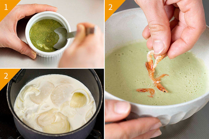 【作り方】 1:玉ねぎとじゃがいもは1ミリ幅にスライス、煎茶(粉末)を牛乳(分量内小さじ1)で溶く 2:鍋に1の野菜と牛乳(150cc)をを加えて、弱火で蓋をして柔らかくなるまで煮込む。粗熱をとったらミキサーに入れ、1の抹茶、昆布茶を加えてカクハンする 3:鍋に2を戻し、残りの牛乳(150cc)を少しづつ加えながら、好みの濃さに伸ばして、塩コショウで味を整える。お好みで桜えびや生クリームを加えてもOK (ごはんさんより) 「じゃがいもを少し多めに入れると甘さが増して、コクもアップします。ベーコンなどを加え、パスタソースにしても美味しいですよ」