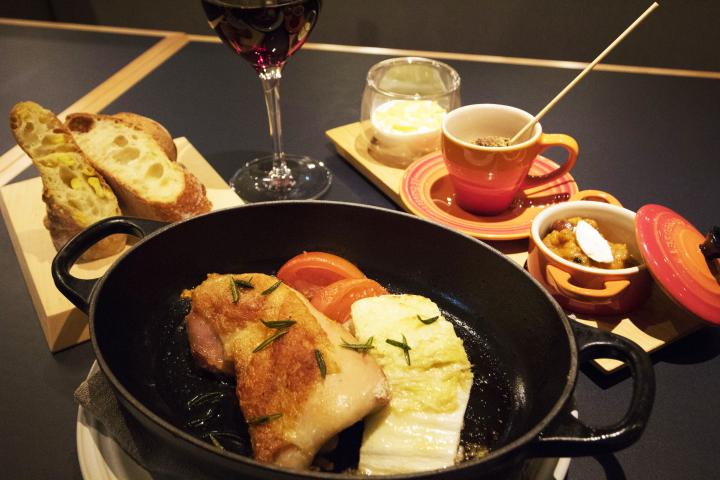 「ブラッスリー コロン」では毎月、テーマ食材が掲げられ、それに沿ったメニューが味わえます。そんなお料理をココットでいただける「ココットランチ 肉料理」をいただきました。メインの肉料理プレートに3種のアミューズ、パンがつきます。