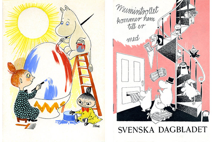 左:トーベ・ヤンソン≪イースターカード 原画≫1950年代 グワッシュ、インク・紙 ムーミンキャラクターズ社、右:トーベ・ヤンソン≪スウェーデンの日刊紙「スヴェンスカ・ダーグブラーデット」広告≫1957年 印刷 ムーミンキャラクターズ社