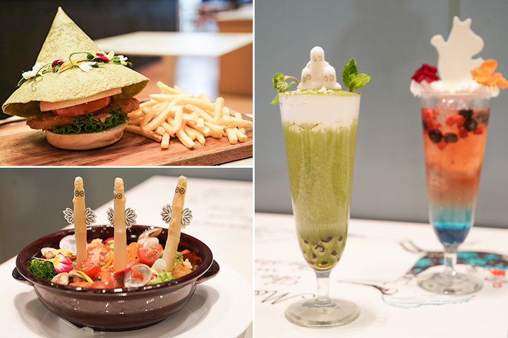 写真左上:スナフキンバーガー(1580円)、写真左下:ニョロニョロパエリア(1720円)、写真右:ニョロニョロの抹茶タピオカドリンク(1250円)、ムーミンお散歩ソーダ(1100円)