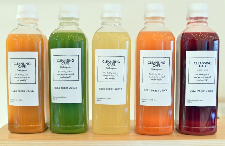 東急東横線代官山駅から徒歩5分、郵便局の横の路地を入って行くと真っ白い壁が目を引く建物が現れます。ここがモデルさんたちの間で話題のコールドプレスジュース専門店「クレンジングカフェ」。白を基調としたかわいい雰囲気の店内は、中央に大きなテーブルが置かれてあり、イートインもできるようになっています。 コールドプレスジュースとは、低速回転の特殊なジューサーで野菜と果物をていねいに絞って作るフレッシュなジュースのこと。一般的なジューサーと違って熱を加えずに絞ることで、酵素やビタミンC、B群などが壊れず、素材の持つ栄養がそのまま取り込めるというすぐれものです。