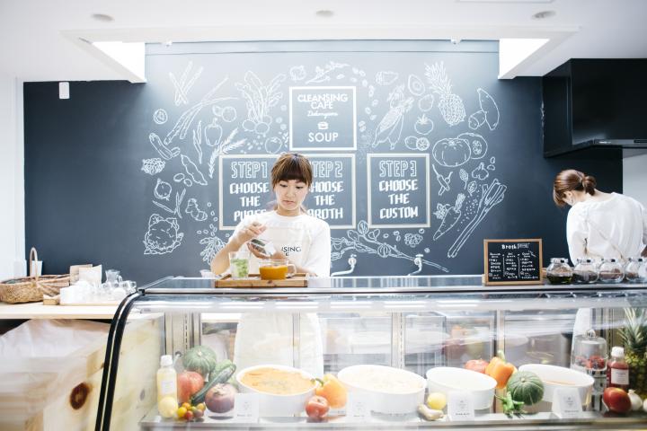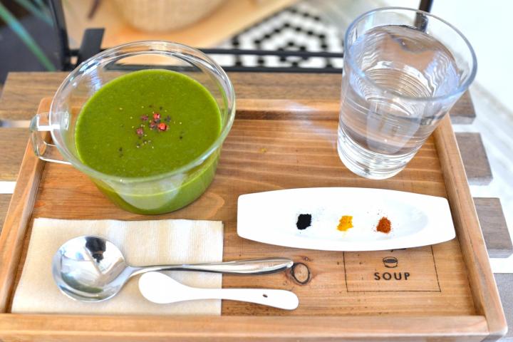 ジュースクレンズで体をリセットした翌日は、流動食をとりましょう。お店のスタッフによれば、休んだ胃に急激に固形の食べ物が入ると、せっかく整った体が崩れやすくなってしまうため、回復食のお粥やスープを食べるのが一般的なのだそう。カフェでは、クレンジング後の食事にぴったりなスープ(1カップ1080円)も提供しています。