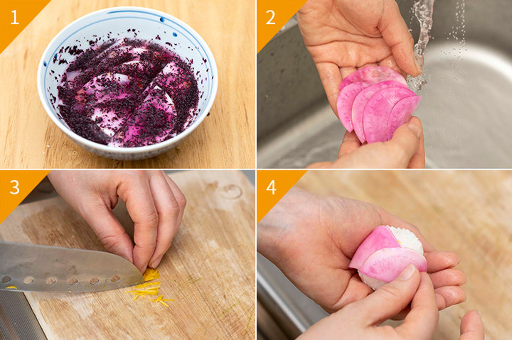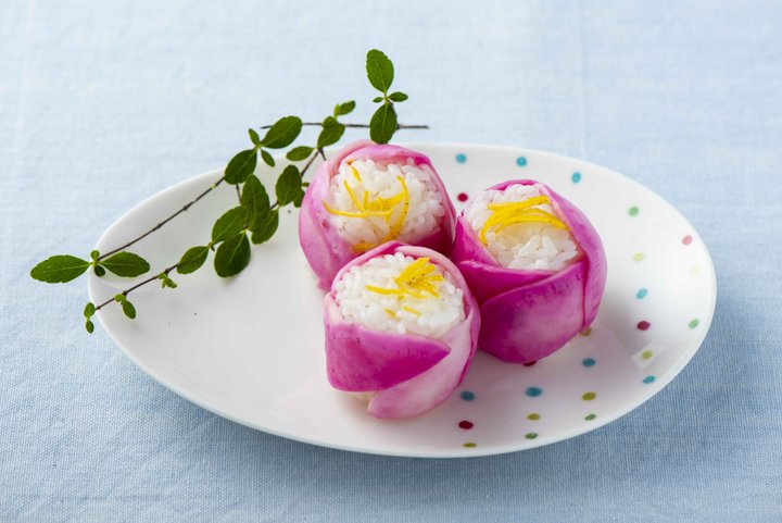 【作り方】 1:かぶは1ミリ幅にスライスして、★を合わせた液にに30分程漬けておく 2:1のカブを水で洗う 3:レモンの皮を削いで、千切りにする 4:ごはんと寿司酢を合わせて作った酢飯をを4等分にして丸く結ぶ。2のカブをまわりに花びらのように重ね、レモンの皮を上に添えたら完成 (ごはんさんより) 「ゆかりを洗い流すときは、色が抜けやすいのでサッとすすいでください。また、ごはんにカブを巻く際は、ラップで包んでからしばらくそのままにしておくとなじみますよ」。